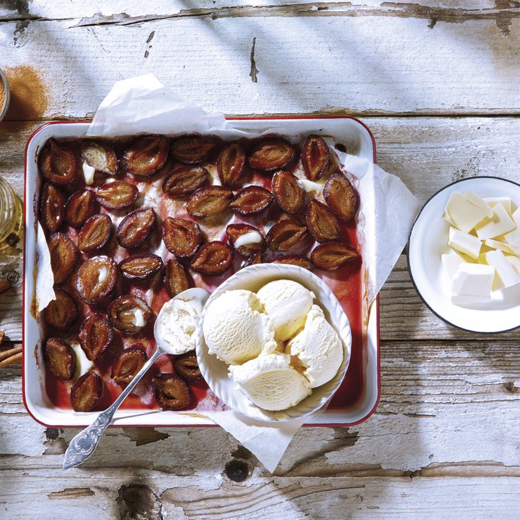 Karamellisierte Pflaumenhälften aus dem Ofen mit Vanille Eis