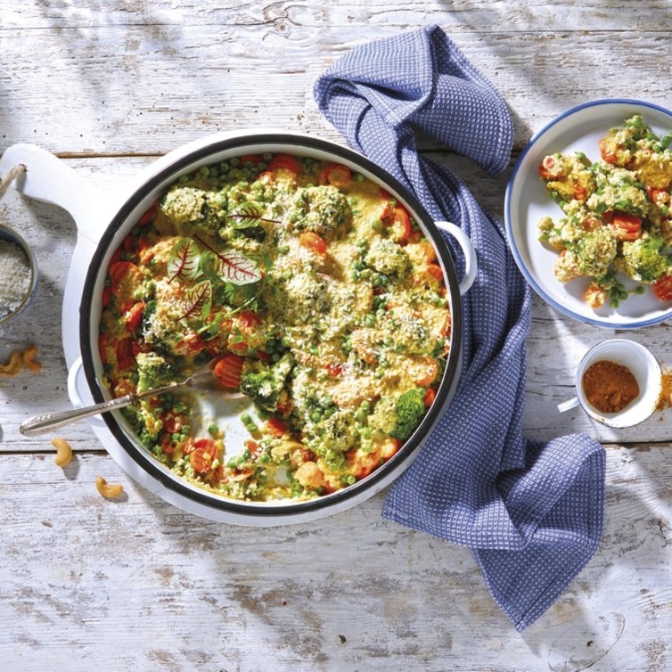 Cashewcreme auf dem Gemüse verteilen, mit Kokosraspeln bestreuen und im vorgeheizten Backofen bei 180 °C Ober-/Unterhitze Eco (160 °C Heißluft Eco) ca. 20 - 30 Minuten garen. Gratin auf Tellern anrichten und servieren.