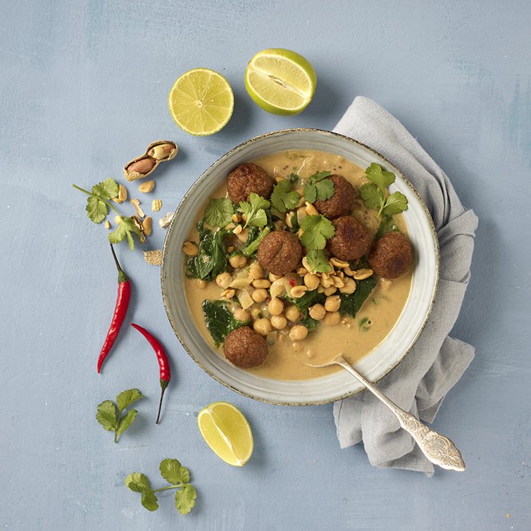 Kichererbsen-Spinat-Curry mit veganen kein-Hack Bällchen