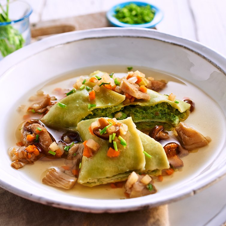Pro Teller eine fertige Maultasche einlegen und mit Pilzbrühe auffüllen. Mit Schnittlauch-Röllchen dekoriert servieren.