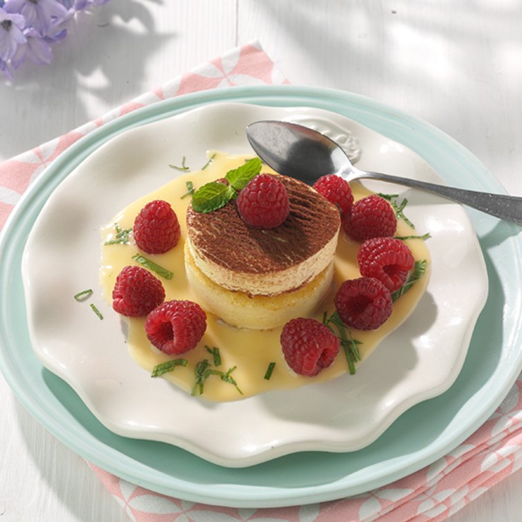 Die marinierten Himbeeren um das Törtchen herumsetzen, jedes Törtchen mit zwei Blättern Minze und einer Himbeere dekorieren.