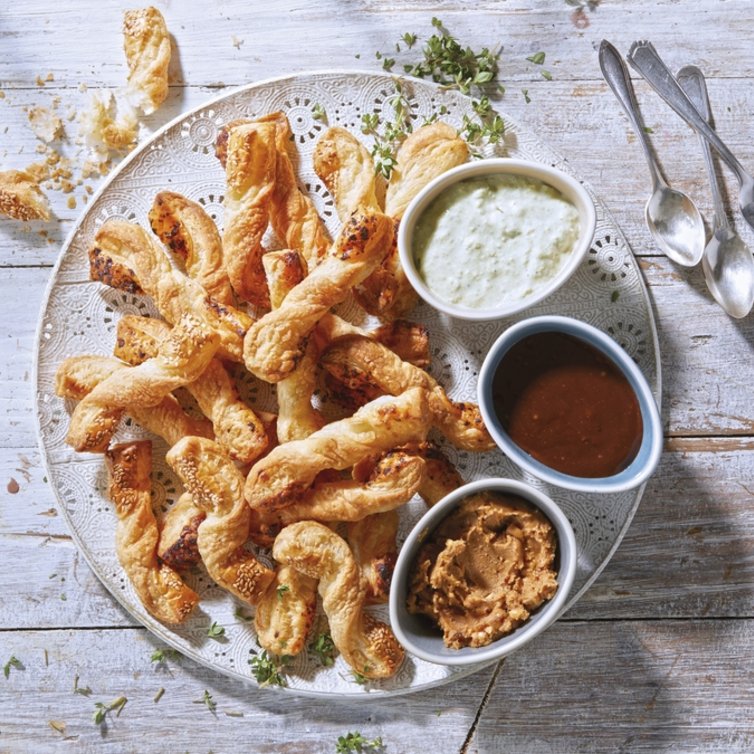 Blätterteig in ca. 1 cm breite Streifen schneiden, verdrehen und auf zwei mit Backpapier ausgelegte Backbleche legen. Ei verquirlen, die Blätterteigstreifen damit bestreichen. Je ein Drittel mit Chiliflocken, Sesam und Hagelzucker bestreuen und im vorgeheizten Backofen bei 200 °C Umluft ca.13 - 15 Minuten goldbraun und knusprig backen.