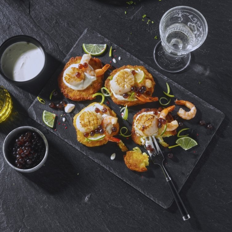 Knusprige Röstinchen mit Jakobsmuschel & Riesengarnele