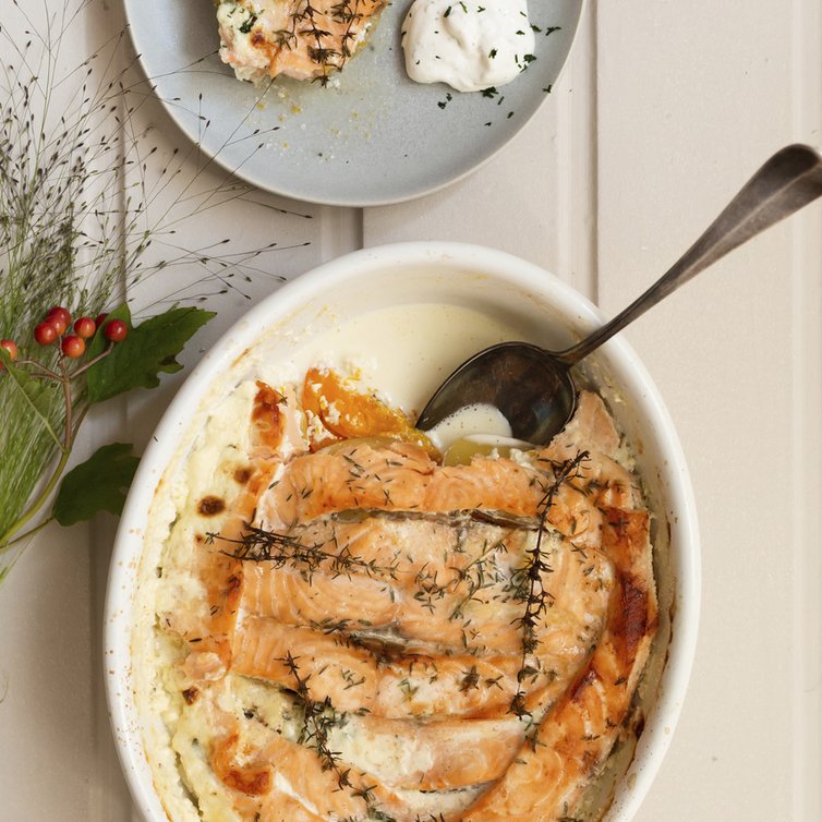 Eine feuerfeste Form mit 1 EL Olivenöl einfetten und die Lachs-, Kartoffel- und Kürbisstreifen dachziegelmäßig in die Form schichten. Thymianblätter darüber verteilen und die Sahne Mischung darüber gießen.