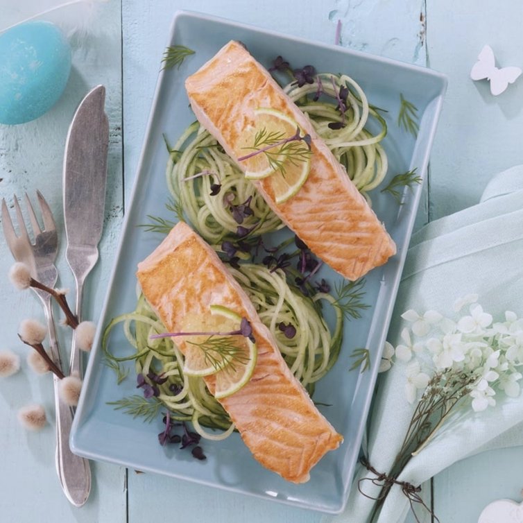 Die Lachsfiletportionen auf Gurken-Spaghetti anrichten, mit Zitronenscheiben und Sprossen dekorieren und gleich genießen.