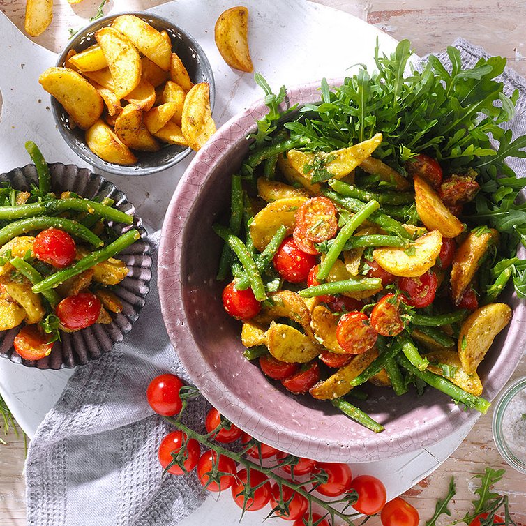 Für das Dressing Pesto, Öl und Essig verrühren, mit Bohnen, den noch warmen Rosmarinkartoffeln und Tomaten vermischen und mit Salz und Pfeffer würzen. Rucola vorsichtig untermischen und den Salat servieren.