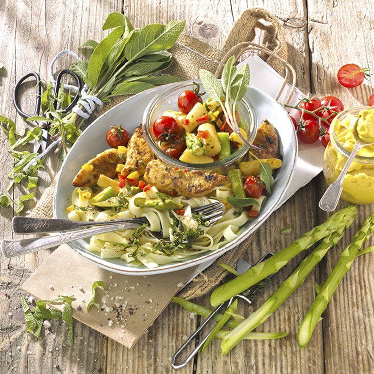 Mai Pasta mit Spargel und Hähnchenfiletspitzen