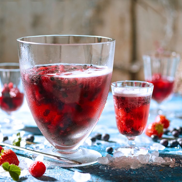 Kurz vor dem Servieren den Blaubeer-Sirup, den restlichen Wein und die restlichen gefrorenen Früchte in das Gefäß geben, vorsichtig umrühren. Mit dem Sekt oder dem Mineralwasser aufgießen und direkt servieren. Skål!