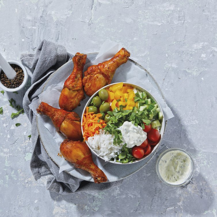 Kurz vor dem Essen den Salat und die Oliven zu dem Reis geben und mit dem Dressing alles zusammen mixen. Mit den Kräutern oder Frühlingszwiebelröllchen bestreut zu den Drumsticks servieren.