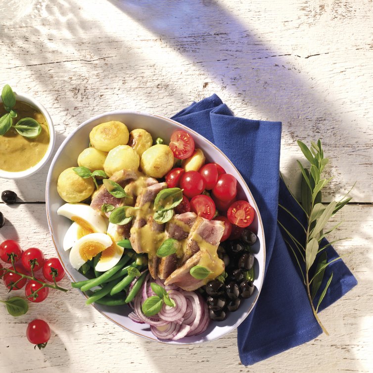 In vier Servierschüsseln den gemischten Salat verteilen. Die gegrillten Minikartoffeln, die Prinzessbohnen, die halbierten Tomaten, Zwiebelringe, halbierten Eier sowie die Oliven darauf anrichten. Die Thunfischsteaks in dünne Scheiben schneiden und ebenfalls hinzufügen. Zum Schluss das Dressing über die Bowls träufeln und mit frischem Basilikum garnieren.