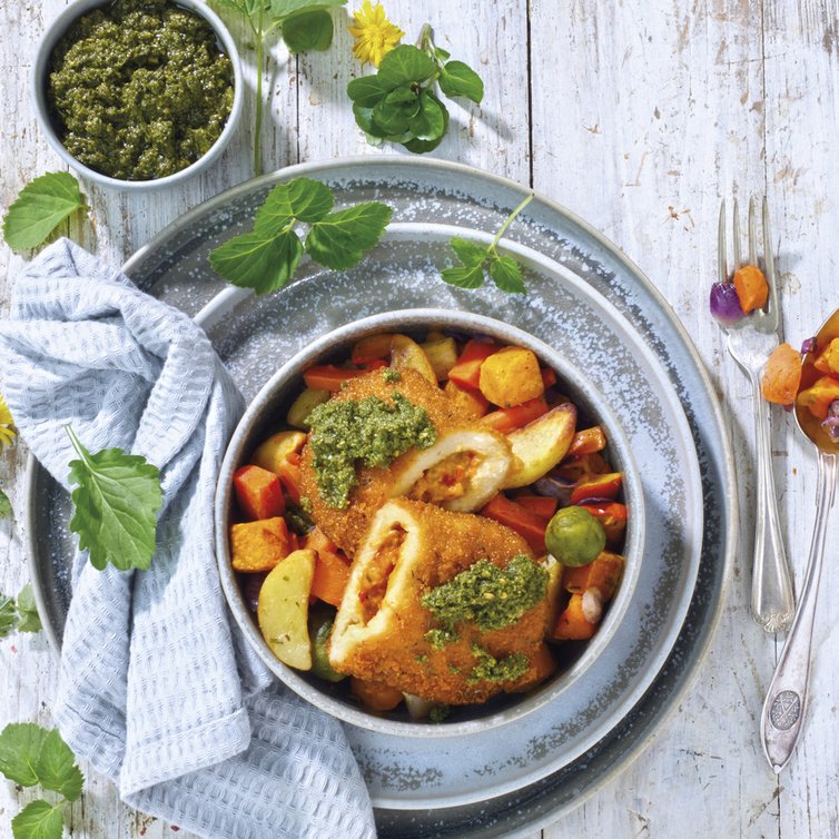 Das Ofengemüse in einer Bowl anrichten, die Chicken Tasche mittig daraufsetzen und mit Wildkräuter-Pesto beträufeln.