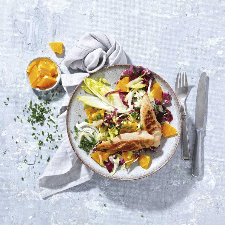 Salat locker auf Tellern verteilen. Hähnchen-Filetspitzen und Orangenviertel dazu anrichten, mit der Vinaigrette beträufeln und Schnittlauchröllchen darüberstreuen.
