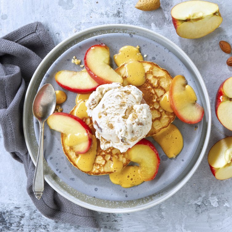 Pancakes mit karamellisierten Äpfeln und Mandelsabayon