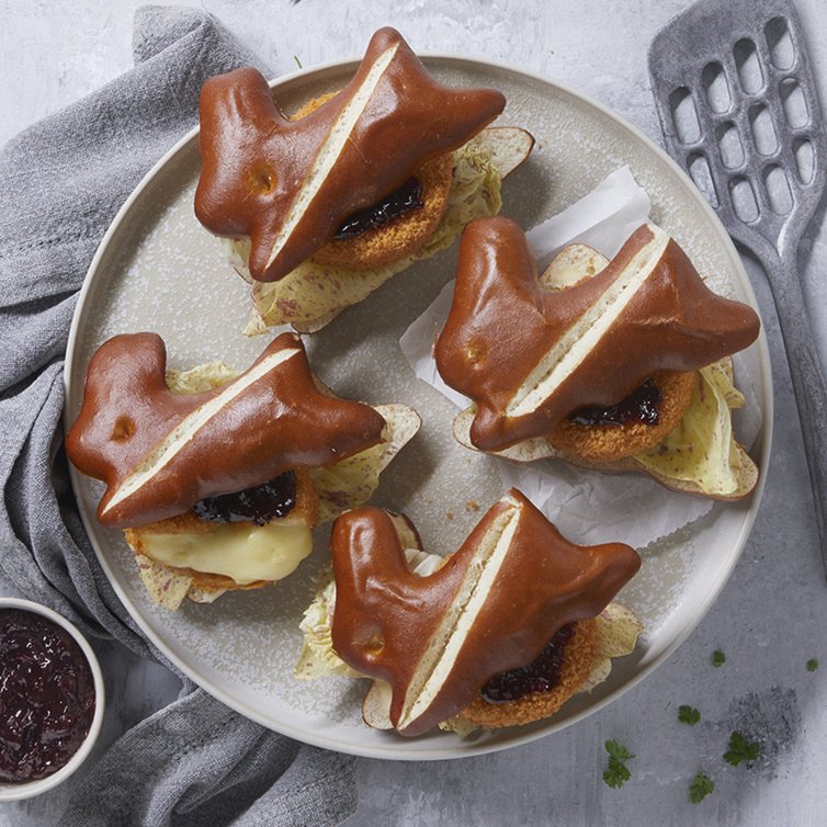 Jeweils ein Salatblatt und gebackenen Camembert auf eine Häschen-Hälfte setzten und mit einem Kleks Fruchtaufstrich toppen. Häschen zuklappen und auf Pariser Art genießen.