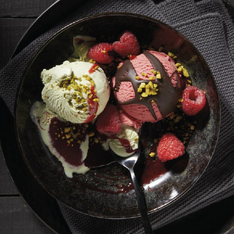 Das Pistazieneis und das Himbeersorbet in Locken oder Würfel portionieren und mit Schokowunder und Himbeersoße anrichten. Mit Himbeeren und Pistazienkernen dekorieren.