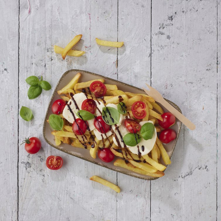 Die knusprigen Pommes auf Teller verteilen, mit Mozzarellascheiben und Cocktailtomaten belegen und mit Olivenöl und Aceto Balsamico gleichmäßig beträufeln. Mit Meersalzflocken und frisch gemahlenem schwarzem Pfeffer würzen und mit Basilikumblatt garnieren.