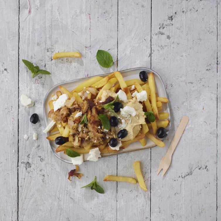 Die knusprigen Pommes auf einem Teller anrichten und mit Bratensauce übergießen. Einen Löffel Hummus in die Mitte setzen, gefolgt von zartem Hähnchengeschnetzeltem. Die Fritten mit einigen schwarzen Oliven und zerbröckeltem Fetakäse garnieren und das Ganze mit einer Minzgarnitur abschließen.