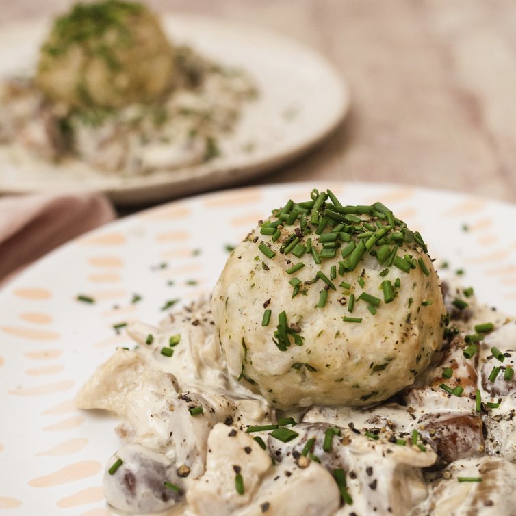 In einen Suppenteller die Pilze geben und pro Portion mit der Schaumkelle direkt aus dem Topf je 1-2 Klöße einsetzen. Mit Schnittlauch üppig dekoriert servieren.