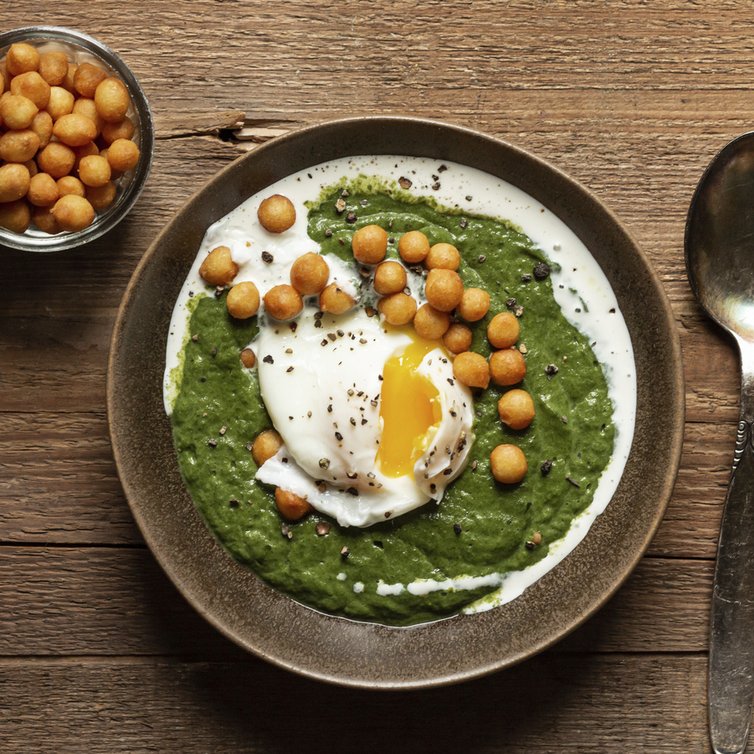 Suppe in Teller füllen und mit pochiertem Ei, knusprigen Backerbsen und Spinatsprossen dekoriert rasch servieren.