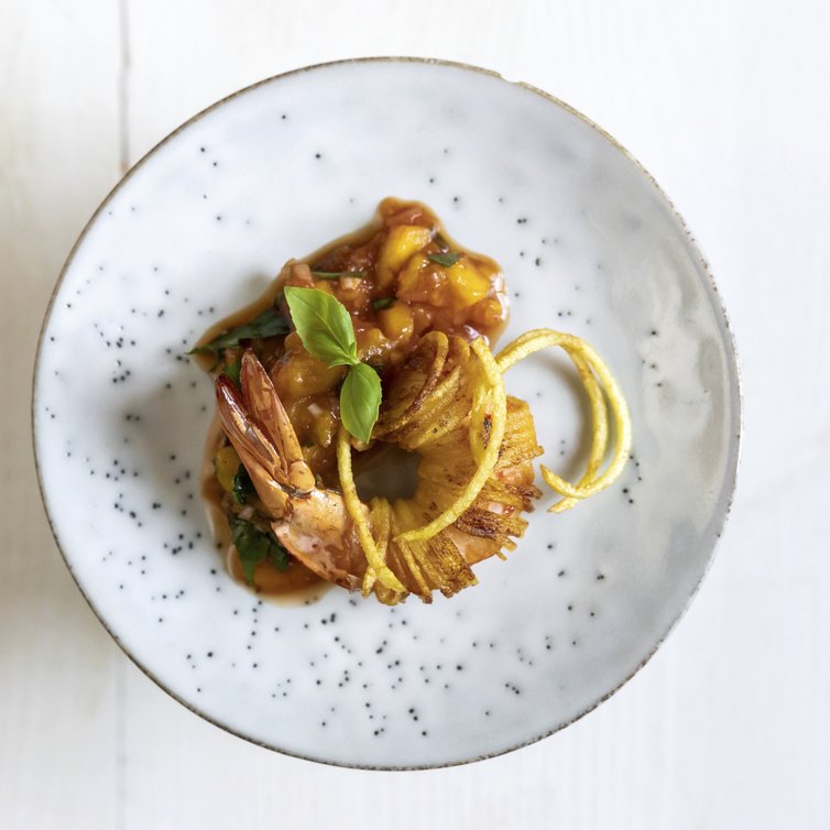 Die Sweet Chili Soße auf Tellern anrichten, die Riesengarnele darauf drapieren und mit frischer Blattpetersilie garnieren.