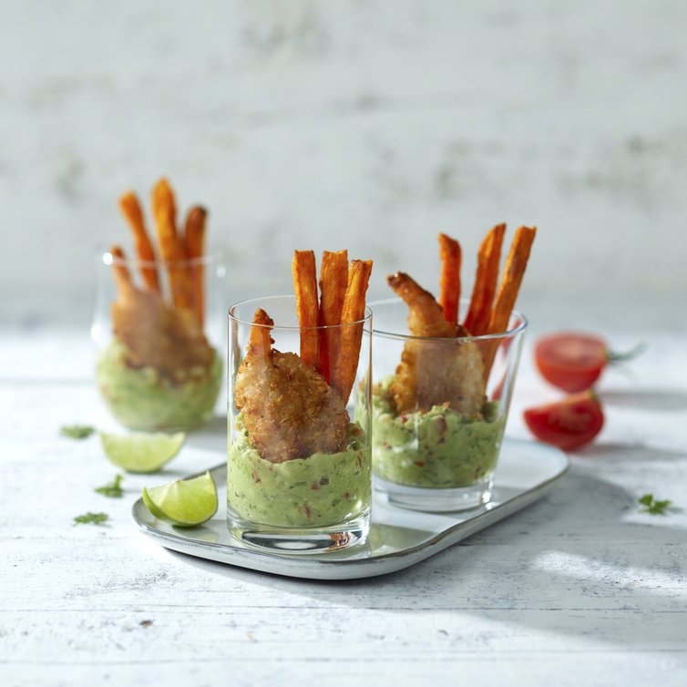 Riesengarnelen mit Guacamole und Süßkartoffelpommes