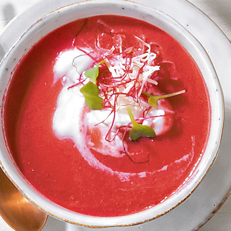 Vor dem Anrichten den geschlossenen Beutel vorsichtig durchschütteln. Die fertige Suppe portionieren, mit Meerrettich-Sahne und Rote Beete-Sprossen garnieren.