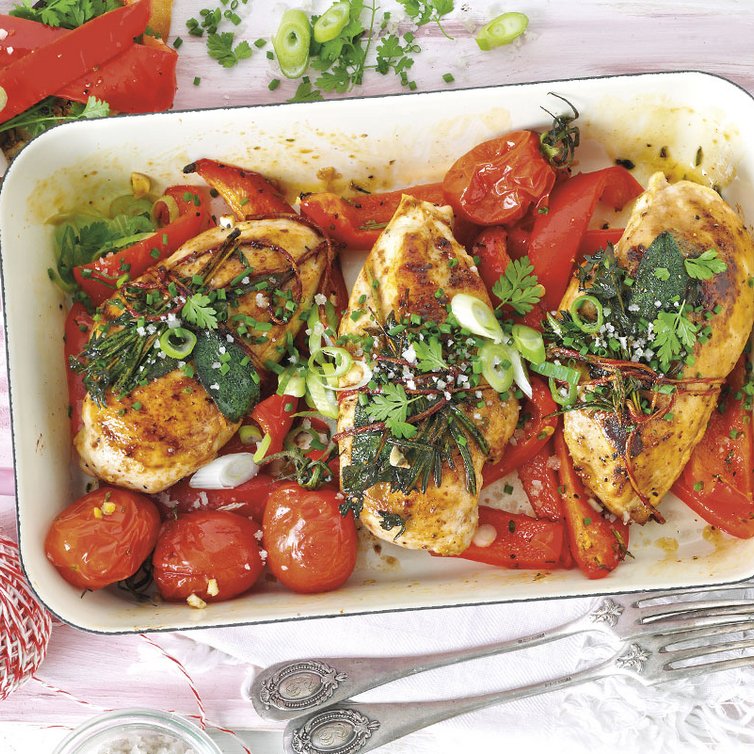Anschließend die Hähnchenbrust auf das Gemüse in die Auflaufform legen. Das Kräuteröl über das Gemüse und die Hähnchenbrust träufeln. Alles in den Backofen geben und im heißen Ofen bei 200°C Ober-/Unterhitze (Umluft 180°C) 25 Minuten garen.