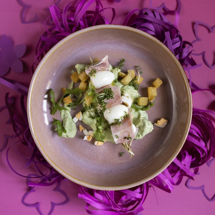 Schinken und Wachteleier auf Kräutersoße (von Johann Lafer)