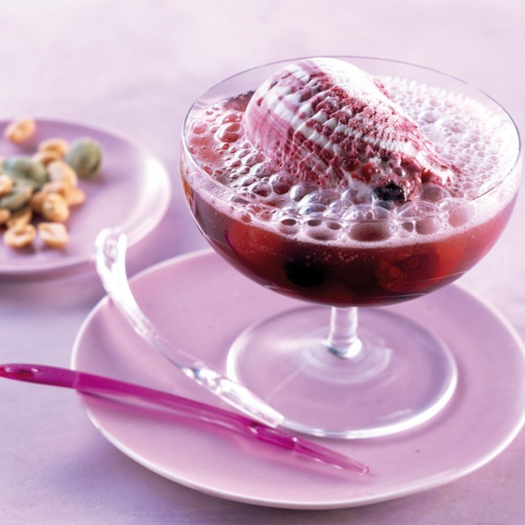 Das Eis in Scheiben oder Kugeln portionieren und auch in die Bowle geben.