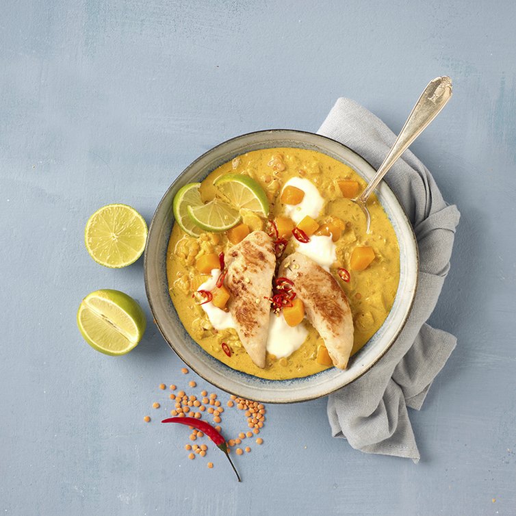 Schnelles Kürbis-Linsencurry mit Hähnchen