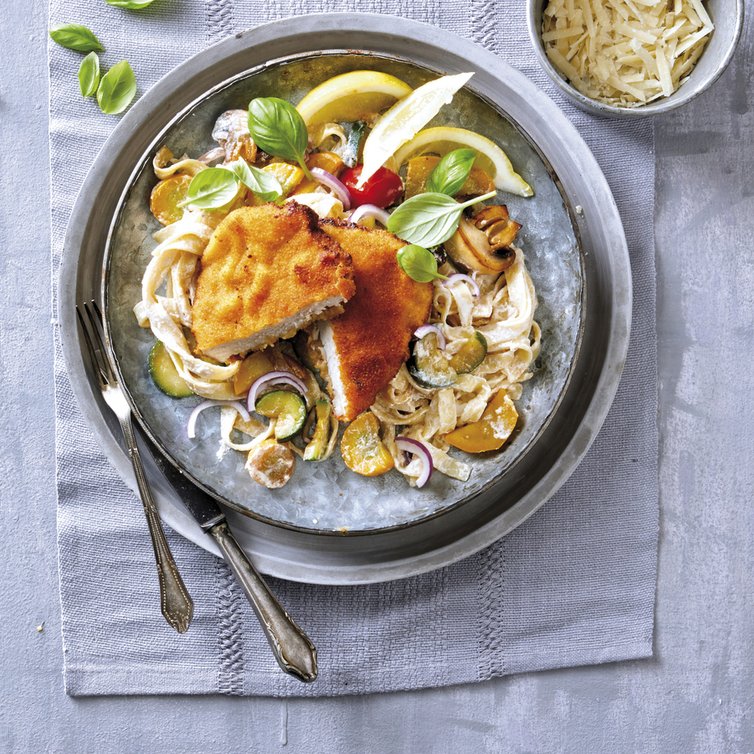 Die Tagliatelle unter das Gemüse heben und mittig auf vorgewärmte Teller geben. Pro Portion das Schnitzel schräg einmal durchschneiden und an die Tagliatelle legen. Mit Parmesanspäne, Zitronenspalte und Basilikumblättchen dekoriert servieren.