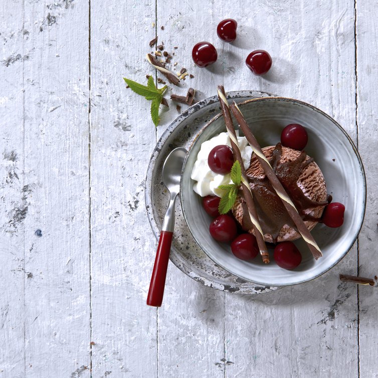 Vor dem Servieren ein paar Eiskugeln in das Glas geben. Fertige Eiskugel daraufsetzten und üppig mit einem Sahnetuff, einer Sauerkirsche und Schokostäbchen dekorieren. Sofort servieren.