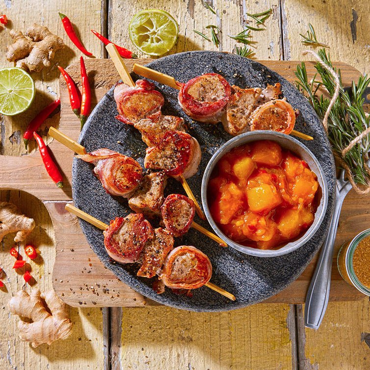 Die Schweinemedaillons etwas antauen lassen und in mundgerechte Würfel schneiden. Die Hälfte der Fleischstücke mit Bacon umwickeln und abwechselnd auf nicht zu große Tandoori-Spieße stecken und in heißem Öl auf mittlerer Stufe in der Pfanne braten.
