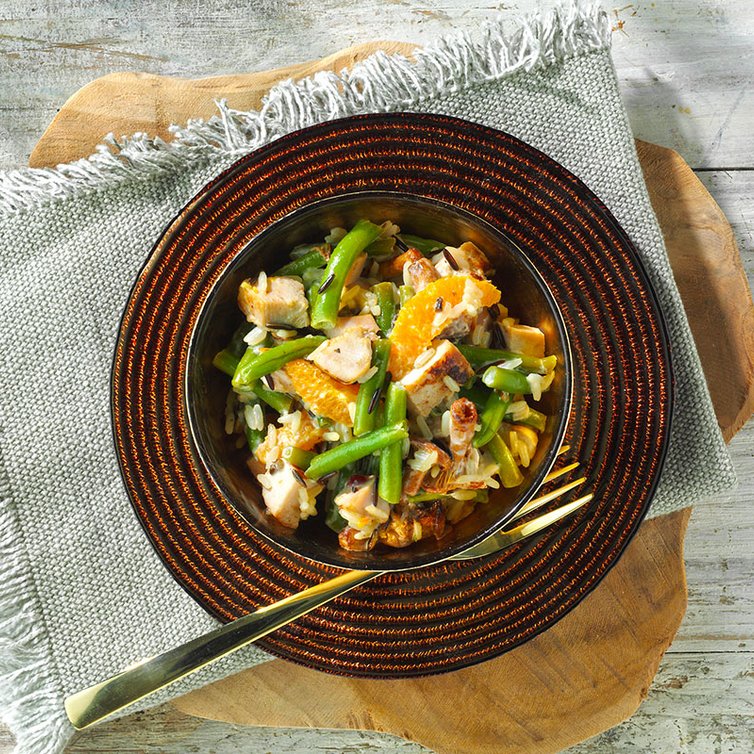 Hähnchenbrustfilet in kleine Würfel schneiden, mit Bohnen, Pfifferlingen, Reis, Orangen (einige für die Garnitur beiseite stellen) und Dressing vorsichtig vermischen und auf Tellern dekorativ anrichten. Geflügelsalat mit übrigen Orangenfilets und Kräutern garnieren und servieren.