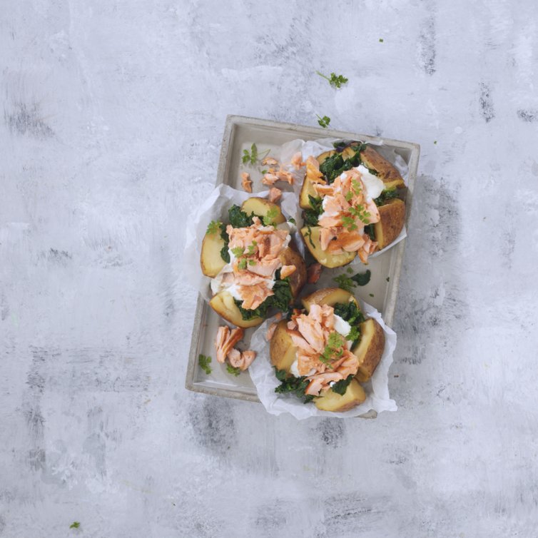 Die fertig gebackenen Kartoffeln vorsichtig aus der Folie wickeln, kreuzförmig einschneiden und mit leichtem Fingerdruck öffnen. Zuerst Spinat, dann 2 El Sauerrahm und anschließend Lachsfilet hineingeben und servieren.