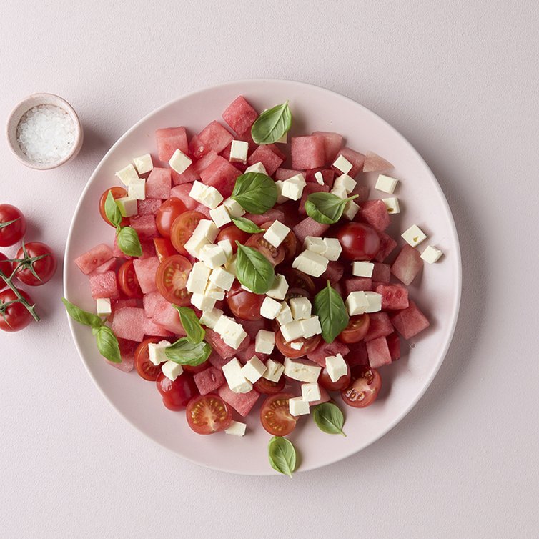 Fruchtig, frisch und herrlich sommerlich: Dieser Salat aus Wassermelone, Tomate und Feta ist der perfekte Begleiter für warme Tage. Mit einem feinen Zitronen-Basilikum-Dressing verfeinert, ideal zum Mitnehmen fürs Picknick oder unterwegs.