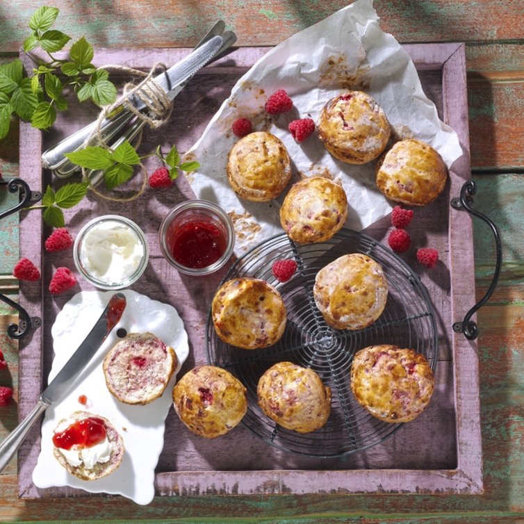 Himbeeren etwas antauen lassen und grob hacken. Für den Teig weiche Butter, Mehl, Backpulver, Zucker und Buttermilch (einen EL zurück behalten zum Bestreichen) in eine Schüssel geben und zu einem geschmeidigen Teig verkneten. Himbeeren vorsichtig, aber schnell unterkneten.
