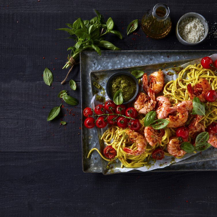 Spaghetti Pesto mit gebratenen Rotgarnelen