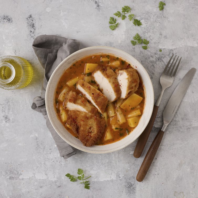 Das fertige Gulasch mit der angerührten Speisestärke binden, mit Butter verfeinern und kräftig mit Salz und Pfeffer abschmecken. Petersilie unterrühren und das Gulasch mit aufgeschnittenem Hähnchenbrustfilet servieren.