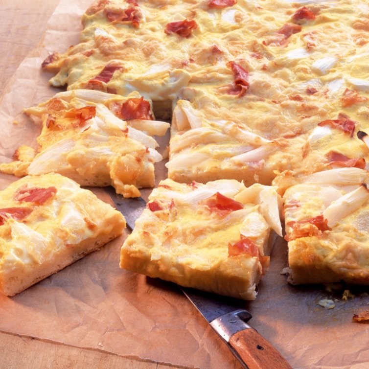 Pizza einmal anders. Es muss nicht immer die klassische Tomatensauce sein. Eine Pizza schmeckt auch mit Sauce Hollandaise fantastisch – vor allem, wenn sich wie hier feiner Spargel unter den Zutaten findet. Probieren Sie’s aus.