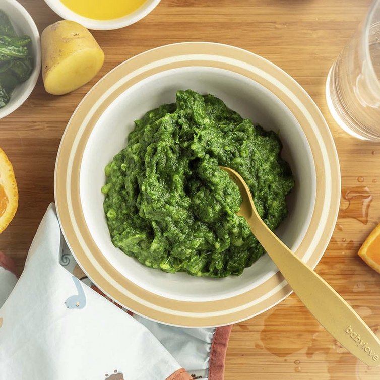 Ein grüner Löffel Genuss: Der Spinat-Kartoffel-Brei versorgt dein Baby nicht nur mit wertvollen Nährstoffen, sondern schmeckt auch herrlich mild. Der frische Orangensaft rundet das kleine Wohlfühlgericht sanft ab – für viele schöne erste Genussmomente.