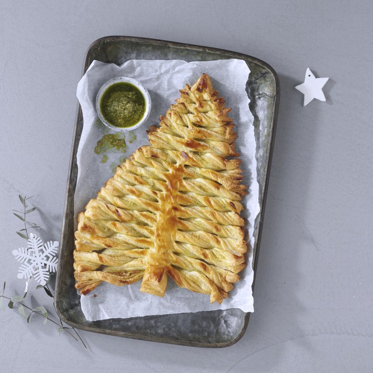 Einen Tannenbaum ausschneiden und bis zur Stammmitte ca. 1 cm dicke Streifen in den Blätterteig schneiden.