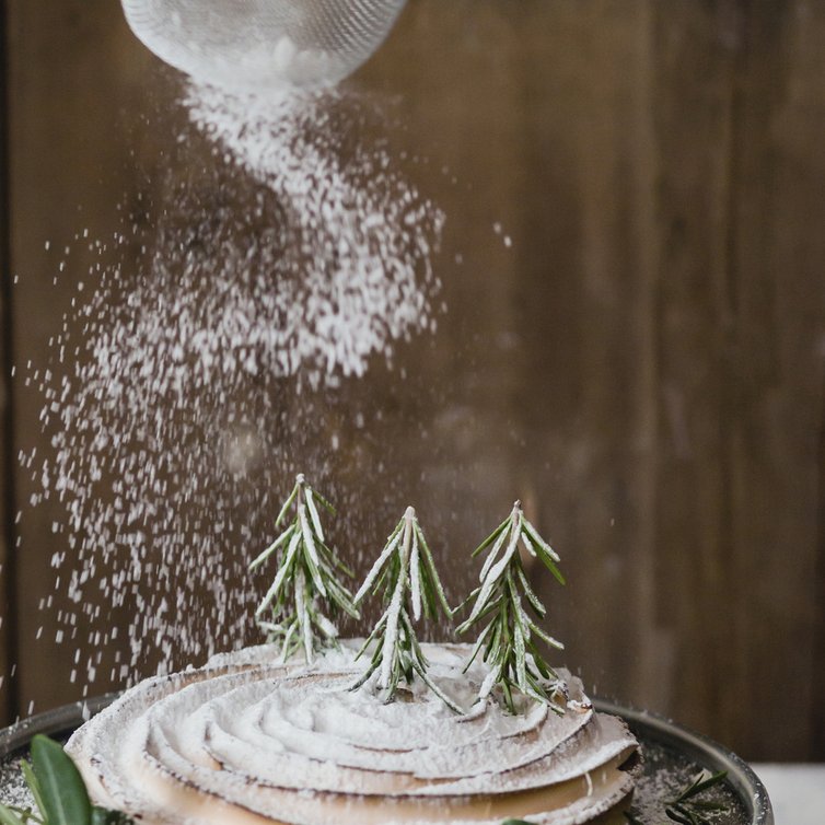 Die Rosmarinzweige wie kleine Tannenbäumchen in den Kuchen stecken und mit dem Puderzucker den Kuchen üppig bestreuen.