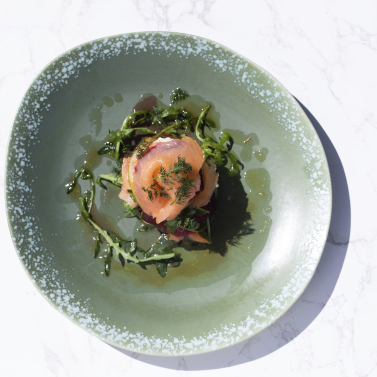 In die Mitte eines Tellers 1 Apfelscheibe legen. Darauf einen Löffel Meerrettichcreme streichen. Einige Rucola Blätter sowie Lachs- und Rote Bete Scheibe darauf verteilen. Dies mit weiteren Apfelscheiben, Salat, Meerrettichcreme, Lachs und Rote Bete wiederholen und so ein kleines Türmchen herstellen. Abschließend übrig gebliebenen Rucola-Salat und frischen Dill rundherum zum Garnieren des Türmchens verwenden