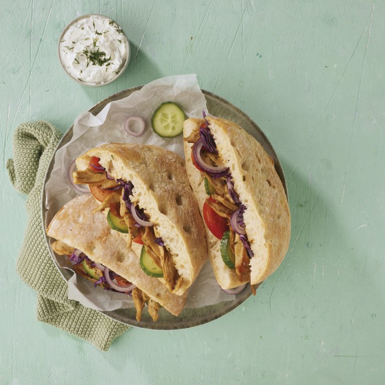 Auf einer glatten Grillplatte oder in der Pfanne das marinierte vegetarische Gyros ca. 7 Minuten unter Wenden anbraten. Die Fladenbrote kurz auf der Grillplatte anrösten, nach Belieben vierteln oder halbieren und aufschneiden. Die Fladenbrote sollen so aufgeschnitten werden, dass eine Tasche entsteht, wobei der Boden nicht durchgeschnitten wird. Die Brottaschen mit Rotkohl, vegetarischem "Pulled-Chicken", Tomaten, Gurken, Zwiebeln und Joghurtsauce befüllen.