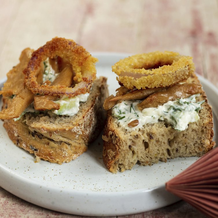 Aus dem Hüttenbrot 8 Scheiben schneiden und diese mit dem Pulled Chicken, der Remoulade und den Zwiebelringen dekorativ belegen.