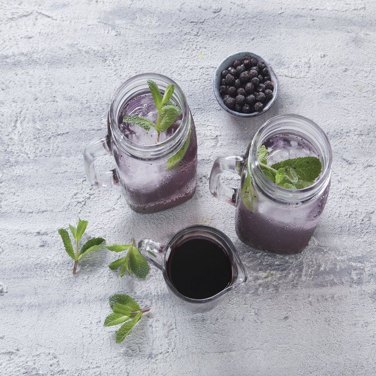 4 dursichtige Lieblingsgläser bis zur Hälfte mit Crushed Ice füllen, Waldheidelbeersirup hinzufügen, bis der Glasboden bedeckt ist. Nach Belieben mit Mineralwasser oder Früchtetee auffüllen. Großzügig mit Minzblättern dekorieren.