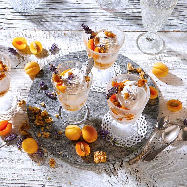In Weckgläsern oder schöne Glaspokale nun die Aprikosen, die Walnüsse und das Eis anrichten. Mit einem Lavendelstängel dekoriert servieren.