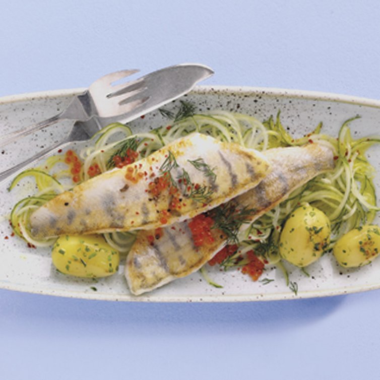 Auf vorgewärmten Tellern erst das Gurkengemüse, dann den Zander und die Kartoffeln anrichten. Mit frisch gehackter Petersilie und Lachs Kaviar dekoriert servieren.