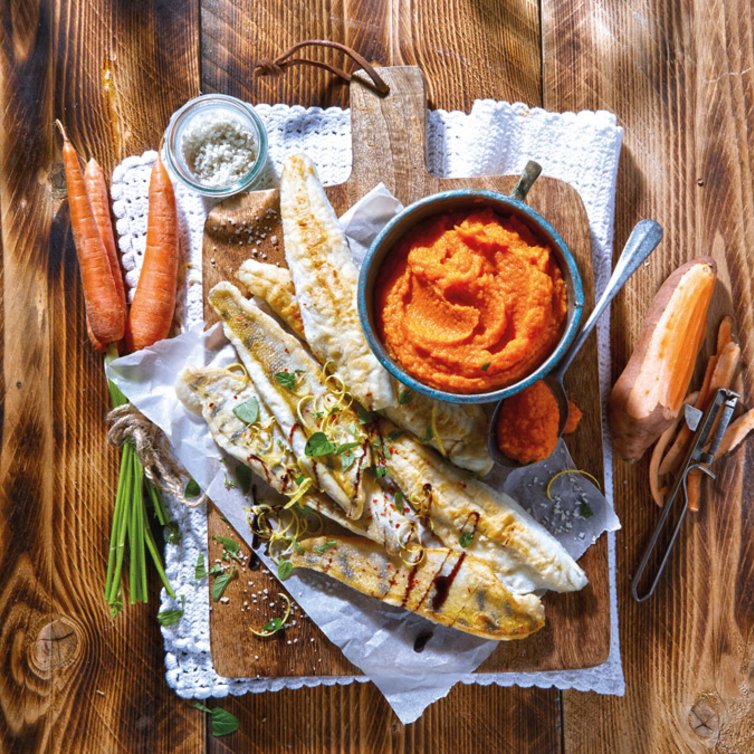 Die Zanderfilets mit dem Möhren-Kartoffelstampf zusammen servieren.